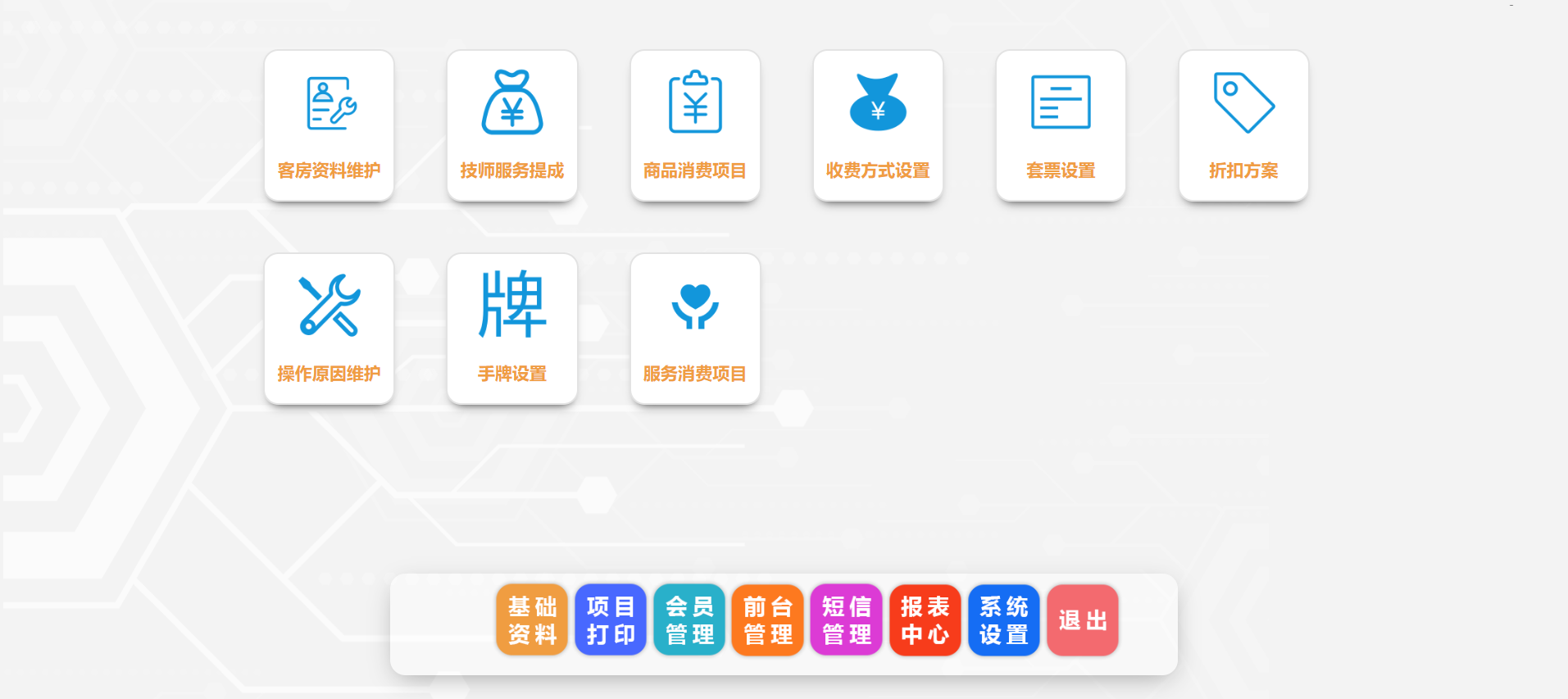 系統(tǒng)正式投入使用前,必須先設(shè)置好基礎(chǔ)檔案?;A(chǔ)數(shù)據(jù)包括手牌資料、客房資料、消費 項目資料、技師提成、收銀方式、折扣方案等。